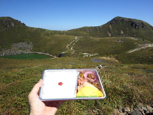 | 慰霊碑の丘で法華院温泉山荘のお弁当(二つ目)を頂く 11時07分 最高に旨い! |