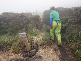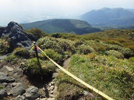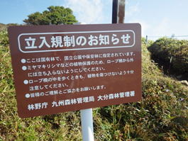 扇ヶ鼻への登山道にて 14時20分 立入規制のお知らせ(看板より) ●ここは国有林で、国立公園や保安林に指定されています。●ミヤマキリシマなどの植物保護のため、ロープ柵から外には立ち入らないようにしてください。●ロープ柵の中を歩くときも、植物を傷つけないよう十分注意してください。●皆様のご理解とご協力を。 林野庁 九州森林管理局 大分森林管理者 |