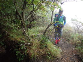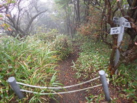 おねがいの貼り紙 14時07分 扇ヶ鼻分岐からも登山道の両サイドに白いロープが張られ、なんとなく嫌な予感がした。ミヤマキリシマ等の植物保護だった。 瀬の本へは、伐倒作業中につき大変キケンですので、通行をご遠慮ください。(貼紙より) ロープにぶら下がっている貼り紙を読んでみたが、地図をよく見ると岩井川岳までは通行できるので、安心して進んだ。 |