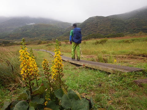 8、オタカラコウの咲く坊ヶツルを歩く 11時49分 木道を歩いてテントサイト方面へ