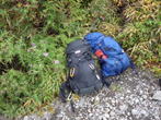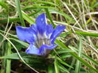 13、大戸越(うとんごし) 13時52分 南峰から16分で大戸越まで下って来た。腰を下ろして休憩。6月にはピンクに染まる平治岳南峰斜面。今は霧が晴れて良く見える。 リンドウ |