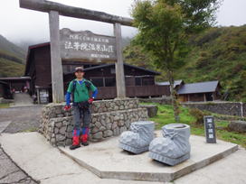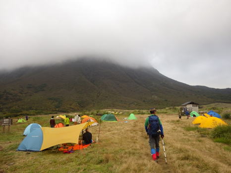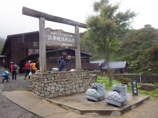 7、法華院温泉山荘ベンチで休憩 11時44分 法華院温泉山荘の看板の前には、大きな登山靴のオブジェが置かれていい感じ。雨はすっかり止んで平治岳が見えてきた。 きままに登山靴 |