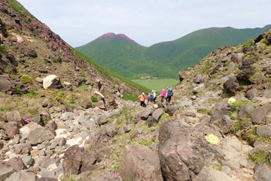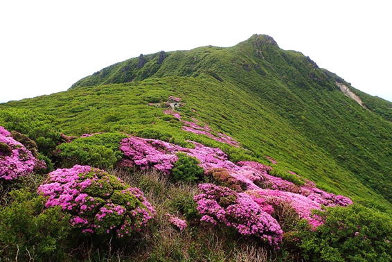 急登を登り切って大船山を望む 10時39分 鮮やかなピンクがグリーンに映える |