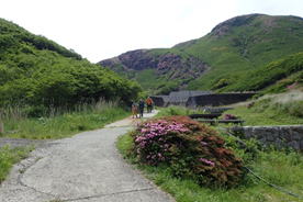 北千里ヶ浜へ 13時54分 法華院温泉山荘の裏側から砂防ダムまでコンクリート道が続く。ちょっと辛い。 親子連れの登山者が楽しそうに下ってきた。 20年前は我が家もファミリー登山を楽しんでいたので、このような光景を見ると微笑ましい。今日はきっと法華院温泉山荘で宿泊だろう。あの頃が良かった。 |