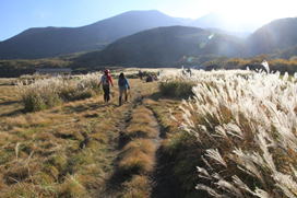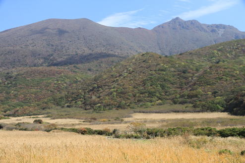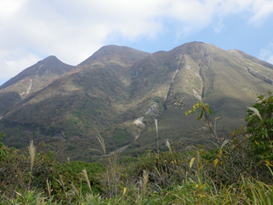坊ヶツルが見えてきた 8時00分 一面がススキに覆われる。左に目をやると6月に山頂一帯がピンクに染まる平治岳が見える。 |