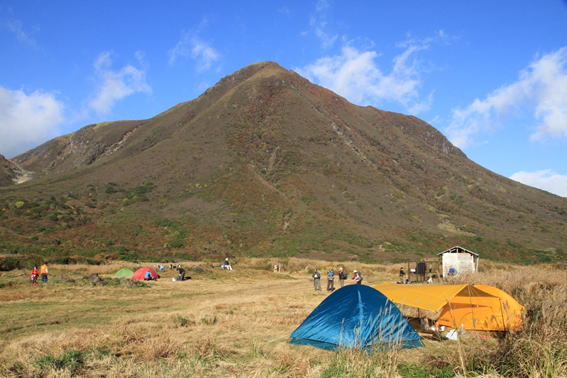 坊ヶツルキャンプ場 (三俣山南峰をバックに) 8時16分 テントは少ない
