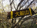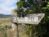 大船山への分岐表示 8時47分 登山口から赤テープを確認しながら30分程歩くと黄色い文字の「大船山」の表示が目についた。 |