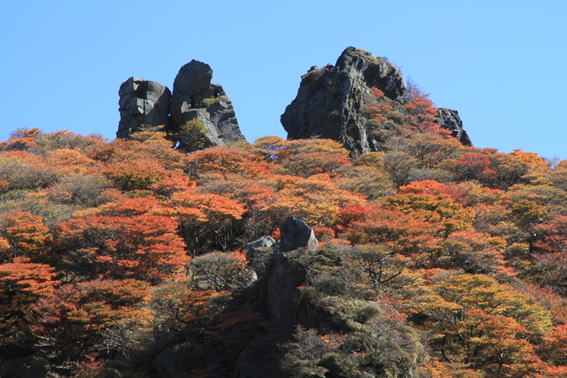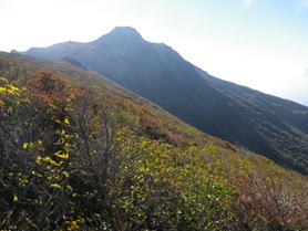三俣山を見ながら下山 15時15分 よ〜く見ると山肌が紅葉しているのがわかる。 |