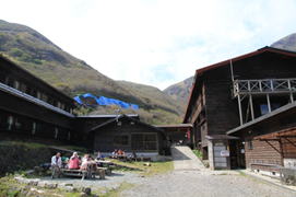 12、法華院温泉山荘 12時35分 標高1303m。ここの温泉は九州で一番高所に湧き出る温泉として有名である。 |