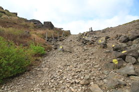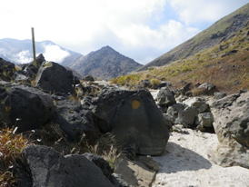 硫黄山の噴煙 14時39分 黄色いペンキに沿って歩いていく。以前と比べて登山道が整備されていてとても歩き易い。 |
