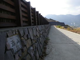 治山工事跡を通過 14時51分 ちょっと前まではこの鉱山道路は落石で道が塞がれていたが、治山工事が完了してとても歩き易くなっていた。ありがたい。 |