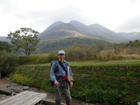 ヘルスセンター裏手で記念撮影 15時49分 24102歩。今日もよく歩いたものだ。最後に三俣山をバックに一枚、記念撮影で締めくくる。 |