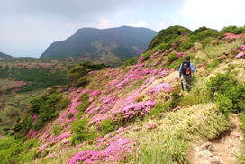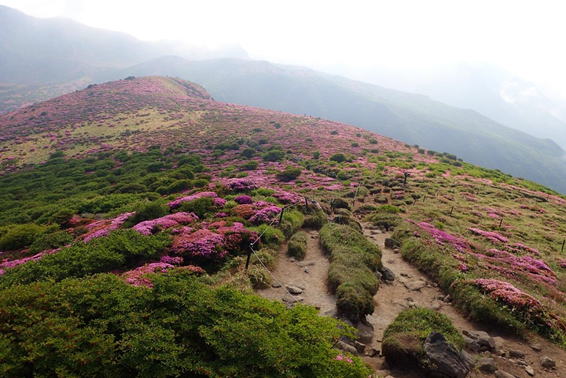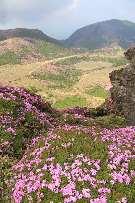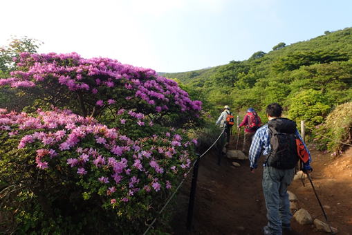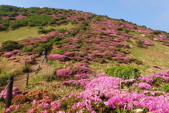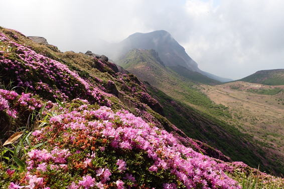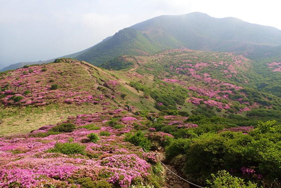 山を彩るミヤマキリシマ 8時28分 扇ヶ鼻を下山する際に目にする素晴らしい風景 |