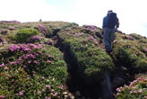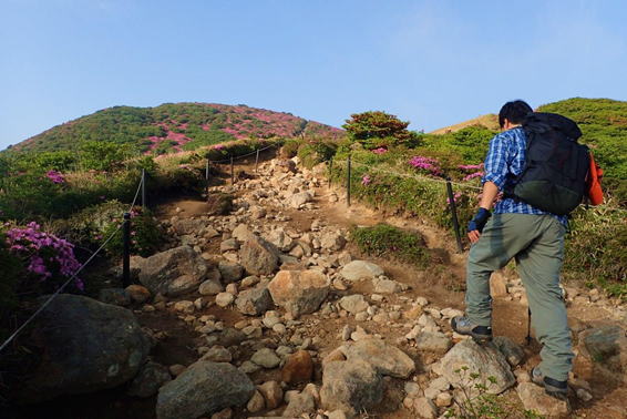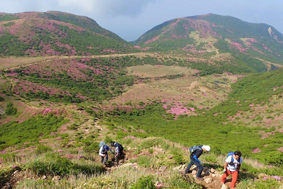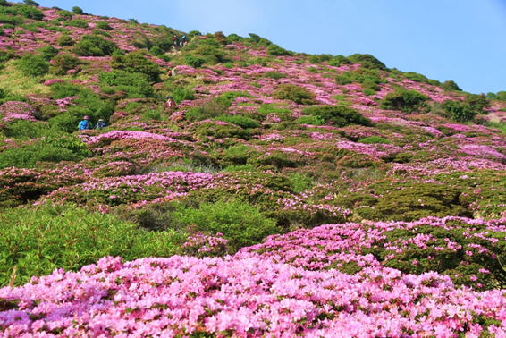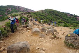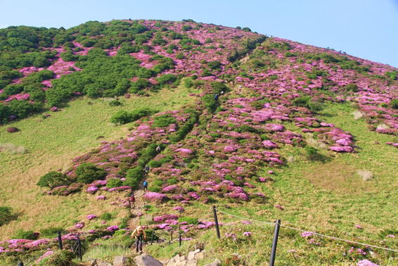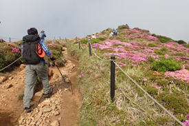 ピンクの絨毯 7時27分 ミヤマキリシマの群落の中を登山者が上っている |