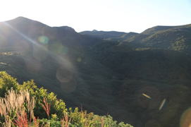 | 沓掛山と歩いて来た登山道 7時44分 振り返ると沓掛山の稜線が全て見渡せる じっと見ていると沓掛山の稜線が円形になって噴火口のように見えるが・・・ |