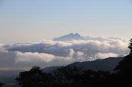 4、沓掛山山頂 6時59分 1503m 狭い沓掛山の岩峰山頂ではベテラン風のカメラマンが真剣に撮影中だった。撮影を中断したのを見計らって山頂碑にタッチ! 「おはようございます」と挨拶をすると、「雲海に浮かぶ阿蘇五岳や由布岳を狙って来たが、雲海の高度が高く山が隠れて残念だ」と話していた。朝日が、眩しくて目を開けていられない。撮影も難しそうだった。 |