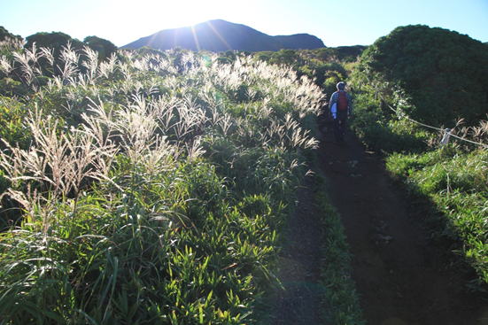 ススキの穂が光る登山道 7時15分 正面から昇る太陽に向かって歩く