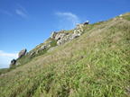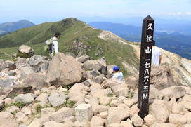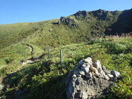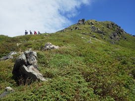 久住山を上る 11時40分 大勢の登山者が山頂を目指していた。やはり九重連山の盟主「久住山」だけある。 小さな子供を連れたファミリーや若者グループが目に付いた。私の様な年配単独行は静かに列の端っこを歩いている。日頃は静かな登山が多いだけに、このような賑やかな山に遭遇すると、ちょっと戸惑ってしまう。久住山だから仕方ないのだが・・。 |