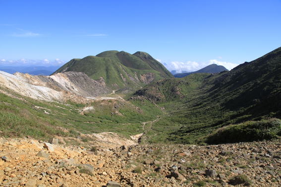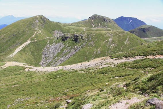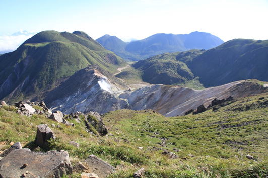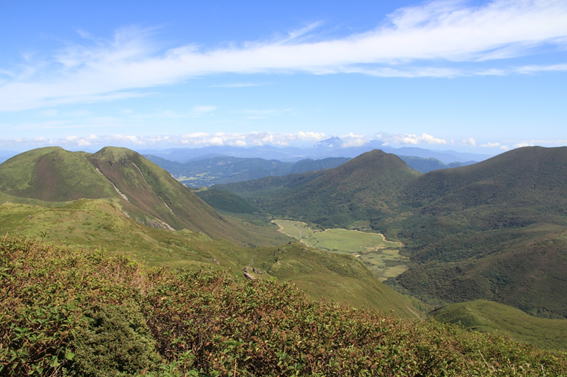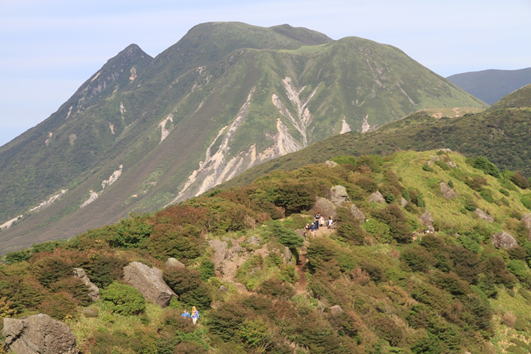 左の白い山肌は硫黄山、正面は三俣山、右奥はミヤマキリシマで有名な平治岳。