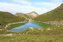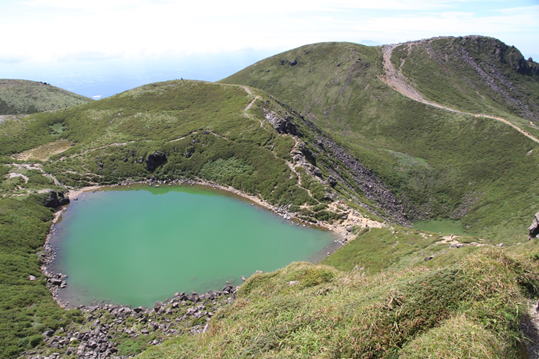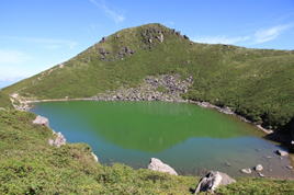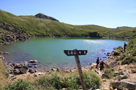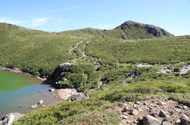 | 天狗ヶ城からエメラルドグリーンの御池(みいけ)を見下ろす 10時57分 右は久住山。御池の上部の稜線に先程参拝した慰霊碑が確認できた。 |