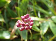 木段に変わる 6時41分 稜線に出る手前でコンクリート道から木段に変わる。牧ノ戸登山口からこの辺りまで上ってくると、大抵の人は(私だけかも知れないが・・)息が上がってしまう。木段になると気分が変わりホッとする瞬間だ!これからの長丁場を考えると登山口からここまではゆっくり歩くことがポイントだろう。木段の両サイドに小さな花がチラホラと顔を出している。どれどれ・・。 |