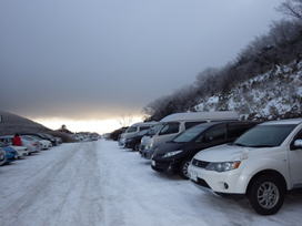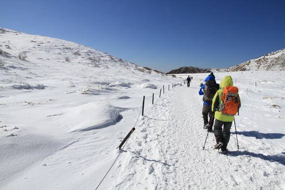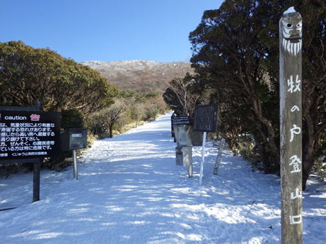 早朝7時30分に牧ノ戸駐車場に到着した。気温は−8℃、さすがに冷え込んでいる。沓掛山を見てみると、山腹にはどんより雲がかかっている。「こんなはずじゃなかったのに」と、また山のお天気に悩まされる。しかし、雲が現れたのはこの時だけで、その後雲は流れて終日快晴、文句なしの冬山登山を楽しむことが出来た。ただ、稜線上はかなりの強風だった。 |