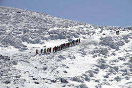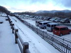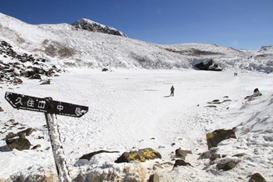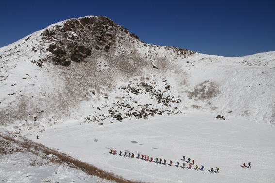 氷結した御池(みいけ) 団体さんが一列になって御池の湖面を歩いている
