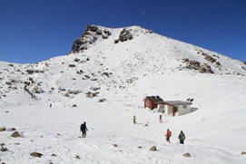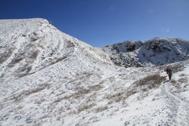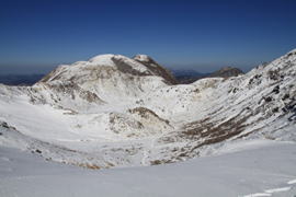 ![]() 坊ヶツル方面は雪が少ない。 山肌も白くなく、雪の降り方が違うのだろう。 |