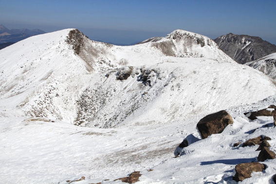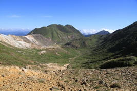 ![]() 慰霊碑から天狗ヶ城(左)と中岳(右)を望む |