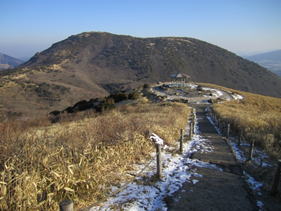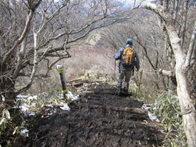 1、牧ノ戸登山口を出発 7時17分 両サイドに少し雪が残るコンクリートの登山道・・・ |