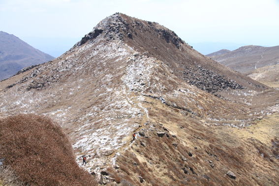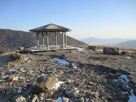 少し登って展望台を振り返る 7時30分 風は穏やか。展望台の向こうには泉水山がくっきりと見える。コンクリの道は続く・・・。 |