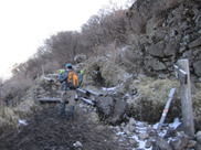 沓掛の尾根を進む 7時57分 鉄製のはしごを下る。滑らないよう慎重に。 |
