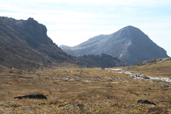 左)天狗ヶ城、右)中岳の双耳峰。ここからは見えないが、中央鞍部の下に火口湖御池がある。
