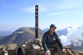 11、中岳山頂 10時56分 1791m ここは九重連峰の中心である。 バックには大船山がくっきりと見える。山頂から偶然、阿蘇の野焼きも見ることができた。 ここで、思いもかけず山口県からのベテラン登山者から饅頭(まんじゅう)を頂戴した。 |