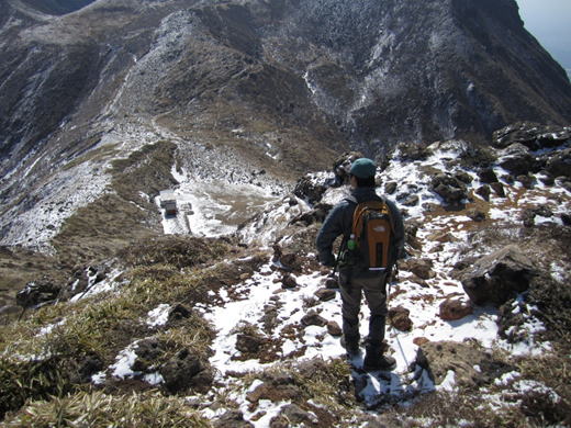 星生崎 眼下に避難小屋が見える。 9時45分 ここから真下に下る。