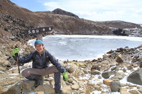 | 天狗ヶ城山頂から凍った御池を見下ろす。右奥は久住山。 |