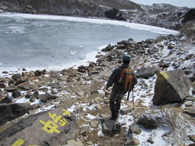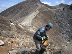 御池の畔を歩いて中岳へ 10時37分 怖々、池に近づいてみる。 危険だ!