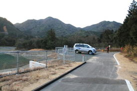 1、7時30分 中国自動車道小郡インターを降りてすぐに目に飛び込んできた山群が今日の目的地。標高はさほど高くない。 高速道路の高架をくぐって山に近づいて行くと「この先車両通行不可」との黄色い看板が目に付いた。 更に500m位進むと明神溜池となり行き止まりである。この溜池横の小さなスペースに車を停めた。 |