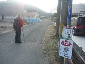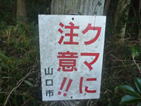 クマに注意! 7時51分 杉の植林を左手に見ながら道路を下って行くと、「クマに注意!」の看板が目に付いた。 「あ〜ここはやっぱり山口県だ」 街に近いのに! |