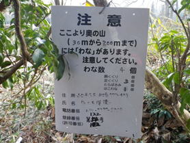 ワナ注意の表示 8時22分 イノシシの駆除をしているのだろうか? 登山口左に 「ワナに注意」 の表示。 こんな表示は初めてお目にかかった。ちょっと緊張した。 右に小さな鳥居が |