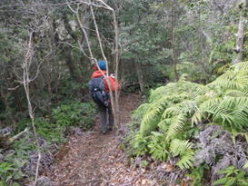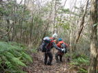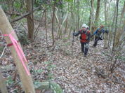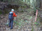 森らしくなってきた 8時42分 落葉のカーペットを踏みしめ気分がいい。 一歩一歩、ピンクのテープを辿り上って行く。 ヨイショっと! |