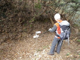 鉄塔案内標識に注意 14時40分 道沿いには鉄塔案内標識が設置されている。 我々は最初この標識の横をまっすぐ進んだのだが行き止まり。どうやらケモノ道らしかった。 標識を右に曲がる |