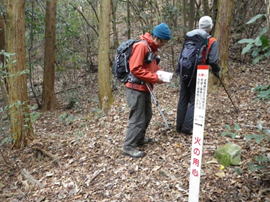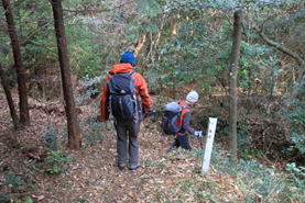 登り切ったと思ったらまた下る 13時17分 下って少し歩くと狐ヶ峰への分岐に出会う。 まっすぐ行けば馬頭観音となる。 あと少しだ |