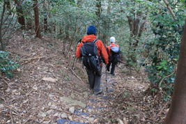鉄塔から鉄塔巡視路を下る 14時29分 ここから車を停めている明神溜池を目指すが、まずは117番鉄塔が目標となる。左の写真の場所は鉄塔のすぐ近く。狐ヶ峰からは右手の道を下って来た。 下り着いたところに右に折り返すような坂道がある。 落ち葉で少々隠れているが、プラスチックの階段になっている。 このプラスチックの階段が中国電力の鉄塔巡視路である。ここから長い階段を下って行く。 |