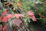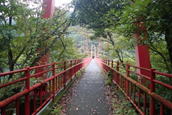 ます渕橋にさしかかる 8時36分 落ち葉が彩る遊歩道を歩いて行くと、すぐに赤い 「ます渕橋」が現れる。渡ることにする。 ![]() |