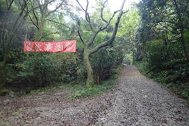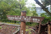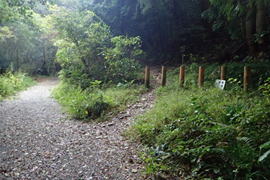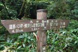 | ここは九州自然歩道のルートとホッテ谷新道との分岐になる。さあどっちに進もうか?と悩んでいたところに、大粒の雨が降ってきた。傘を差して5分程休憩したが状況は変わらない。 |