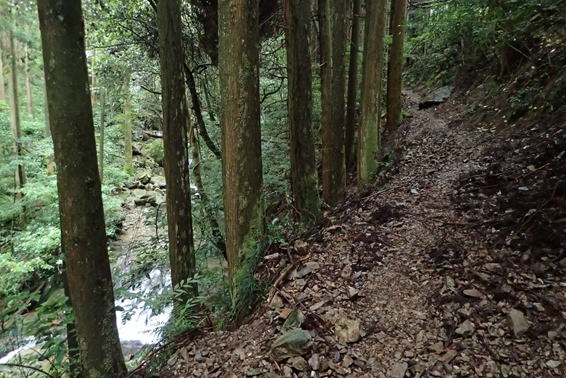 流れの激しい川を下に見ながら登山道を歩く 9時06分 左側は崖になっている |