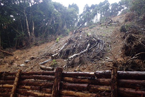 下山時にまた崖崩れ跡を通過 9時45分 土が雨に濡れて滑る |