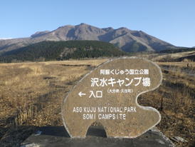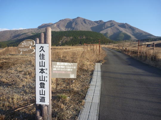 | 「瀬の本高原」から車を走らせ、くじゅう花公園の前を左折、沢水(そうみ)キャンプ場方面に進む。 キャンプ場を左に見て進んで行くとすぐに交差点。その交差点を左に曲がると右斜めに伸びる久住本山(ほんやま)登山道への道が現れる。「なんとお天気がいいのだろう。雲一つないぞ。」 |