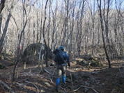 自然林の中を進んで行く 7時59分 啄木鳥(キツツキ)の仲間だろうか?幹を突く音が響く